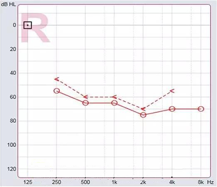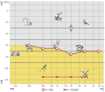 純音測試聽力圖的橫坐標為頻率,從左至右表示測試聲的頻率從低到高,即125Hz至8000Hz;縱坐標為強度,從上至下表示受試者能聽到的最小的聲音強度,以dBHL為單位。如下圖所示:</p><p> </p><center><img alt="" src="/upfiles/201903250213137760.png" width="440" height="400" /></center><p></p><p> 聽力圖的畫法自從1943年在C.C.Bunch的著作中出現后,至今沒有改變。通常右耳的測試結果用紅色表示,左耳用藍色。下圖是ASHA(1990)建議使用的各種標記符號,這些符號已在世界各地廣泛使用。</p><p> </p><center><img alt="" src="/upfiles/201903250213216822.png" width="440" height="250" /></center><p></p><p> 純音測試的測試項目有氣導、骨導、舒適閾與不舒適閾。那么這簡簡單單的聽力圖在驗配過程中有哪些重要作用呢?</p><p> 1、確定聽力損失程度</p><p> 按照世界衛生組織(WHO)1997年的標準,根據0.5kHz、1kHz、2kHz、和4kHz氣導平均聽閾值,將聽力損失分為輕度、中度、重度和極重度。</p><p> </p><center><img alt="" src="/upfiles/201903250213312187.png" width="440" height="180" /></center><p></p><p> 世界衛生組織(WHO-1997)的聽力障礙分級標準</p><p> 舉例</p><p> 下圖為某一聽力損失者所測得的聽力圖</p><p> </p><center><img alt="" src="/upfiles/201903250213367902.png" width="440" height="380" /></center><p></p><p> 0.5kHz的聽閾為65dBHL,1kHz的聽閾為65dBHL,2kHz的聽閾為75dBHL,4kHz的聽閾為70dBHL。則平均聽閾為(65+65+75+70)/4=68.75。將68.75dBHL代入以上分級表格,得到該聽力損失者的損失程度為重度。 聽力損失程度的確定有利于確定助聽器的功率。</p><p> 2、判斷聽力損失性質</p><p> 根據氣導、骨導的關系,可將聽力損失分為傳導性聽力損失、感音神經性聽力損失及混合性聽力損失。</p><p> 骨導與氣導之差大于10dB,且骨導在正常范圍內為傳導性聽力損失,表明聽力下降是由外耳、中耳病變引起。</p><p> 氣骨導一致(≤10dB)且都在正常范圍之外為感音神經性聽力損失。表明聽力下降是由耳蝸、聽神經損傷引起。</p><p> 骨導與氣導之差大于10dB,但骨導在正常范圍之外為混合性聽力損失,表明以上兩種聽力損失均有,由上述多種部位病變引起聽力下降。確定聽力損失性質還需結合臨床表現,也有助于助聽器佩戴效果的預測。</p><p> 3、解釋聽力損失者的日常生活困難</p><p> 聽力損失者在日常生活中經常遇到的問題有1)時而聽得到,時而聽不到;2)聽得到,聽不清;3)小聲聽不到,大聲受不了。</p><p> 時而聽得到時而聽不到</p><p> 以下圖平坦型聽力曲線為例,當周圍言語聲高于其聽閾,即處于曲線下方區域時,該聽力損失者能聽到;當周圍言語聲低于其聽閾,即處于曲線上方區域時,聽力損失者則聽不到對方的說話聲。此為“時而聽得到,時而聽不到”。</p><p> </p><center><img alt="" src="/upfiles/201903250213445950.png" width="440" height="340" /></center><p></p><p> 聽得到 聽不清</p><p> 中文漢語元音輔音的頻率及響度有其分布圖,如下圖所示。以陡降型聽力曲線為例,該聽力損失者聽不到大部分的輔音。聽得清不清楚,主要取決于高頻輔音聽得到聽不到。例如該聽力損失者“g”、“ch”聽不到,但“u”能聽到,因此,他會將“姑姑”、“出租”都聽成“uu”。聽不清楚時,再結合口型,前后句的冗余度猜測。猜對則談話繼續,猜錯則打岔。兒童聽力曲線若是如此,長期接收不正確的語音,會出現口齒不清。</p><p> </p><center><img alt="" src="/upfiles/201903250213526855.png" width="440" height="340" /></center><p></p><p> 小聲聽不到 大聲受不了</p><p> 小聲聽不到,大聲受不了是重振現象。以下圖聽力曲線為例,“飛機”處于不舒適閾附近,聽力損失者對“飛機”的聲音聽著受不了。另外,該聽力損失者聽不到“手表”等聲音。</p><p> </p><center><img alt="" src="/upfiles/201903250214013300.png" width="440" height="385" /></center><p></p><p> 為了更好地使聽力損失者家屬明白聽力損失者的困難,目前有較多的工具可以模擬聽力損失狀態下的溝通與交流。</p><p> </p><center><img alt="" src="/upfiles/201903250214075950.png" width="440" height="370" /></center><p></p><p> 比如,在聲音樣本中選擇“餐廳”,并選擇“正常”,可聽到正常聽力者在“餐廳”環境中聽到的聲音;若選擇“患者”,則可使聽力正常者聽到聽力損失者聽到的聲音,令聽力正常者親身體驗他們所處的“模糊世界”。</p><p> 在“典型聽力圖”中,有“輕度”、“中度”、“重度”、“極重度”、“陡降型聽力”等選項,若選擇“重度”,則可體驗重度聽力損失者所聽到的聲音。</p><p> 4、調試</p><p> 聽力圖在助聽器驗配調試過程中也起著非常重要的作用。</p><p> 首次驗配</p><p> 助聽器處方公式結合聽力圖計算出聽力損失者的目標增益,為驗配師的進一步調節奠定了基礎。聽力圖結果越準確,首次驗配的滿意度越高。</p><p> 調試</p><p> 在助聽器調試過程中,不能忽視聽力圖的作用。舉一實例:下圖為某助聽器佩戴者的聽力圖,經過多次降低高頻增益,仍反應聲音刺耳。通過對聽力圖的觀察,該佩戴者2kHz處的聽閾較高,且2kHz處的增益亦較多。將2kHz處的增益降低后,助聽器佩戴者的滿意度提高。</p><p> 讀懂聽力圖是驗配助聽器過程中非常重要的一環,只有讀懂聽力圖并解釋清楚聽力圖,對成功驗配助聽器可達到事半功倍的效果。在助聽器驗配調試環節,亦不能忽視聽力圖。聽力圖在整個助聽器驗配過程中起到不可替代的作用。</p><p> 更多詳情請登錄聽覺有道助聽器www.caosairsoft.com</p>" />