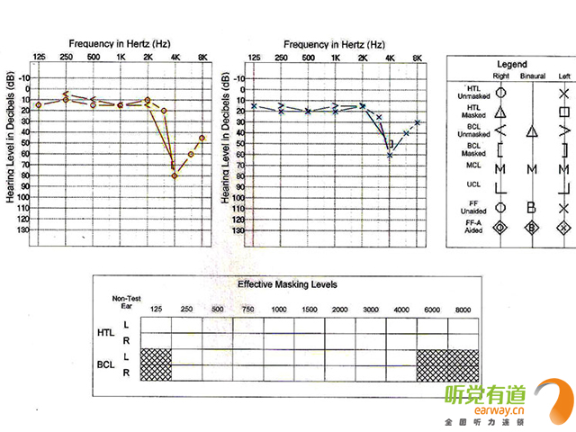接著說一下聽力圖上的圈圈叉叉代表的意思。叉叉表示左耳的氣導(dǎo)聽閾,圈圈表示右耳氣導(dǎo),開口向左的尖括號表示左耳骨導(dǎo),開口向右的表示右耳骨導(dǎo)。旁邊的masked表示加掩蔽之后的聽力。