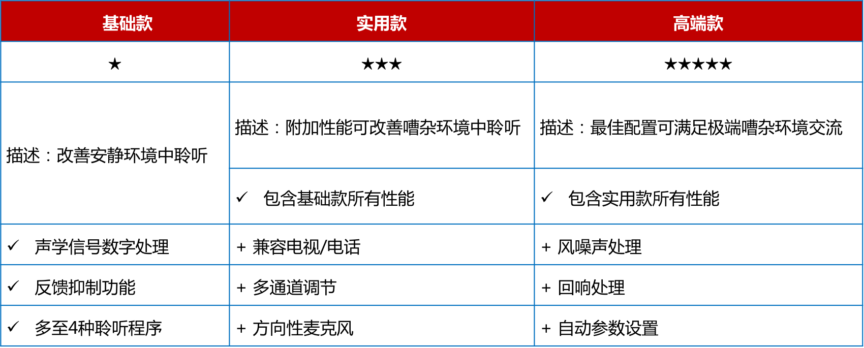 <span style="font-size:16px;"> 助聽(tīng)器價(jià)格取決于機(jī)器的檔次,而檔次由內(nèi)含的技術(shù)種類決定。助聽(tīng)器檔次大致可分為基礎(chǔ)款、實(shí)用款、高端款。這三種檔次的區(qū)別請(qǐng)參見(jiàn)下表:</span></p><p style="text-align: center;"><span style="font-size:16px;"><img src="/upfiles/201808150226553383.png" width="640" alt="" /><br /></span></p><p><span style="font-size:16px;"> 那么,如何應(yīng)該選擇哪種檔次的助聽(tīng)器呢?</span></p><p><span style="font-size:16px;"> 選擇助聽(tīng)器時(shí)主要需要考慮兩大因素。首先要考慮的就是弱聽(tīng)人士的聽(tīng)力損失程度,其次要考慮的就是弱聽(tīng)人士的日常生活方式。比方說(shuō),某位弱聽(tīng)人士是中度聽(tīng)力損失,日常在家為主,那么實(shí)用款檔次助聽(tīng)器通常可以滿足TA的需求。</span></p><p><span style="font-size:16px;"> 當(dāng)然,這里只是為助聽(tīng)器選配提供了大致方向,如何選配仍然需要具體情況具體分析,最好還是需要跟驗(yàn)配師面對(duì)面溝通。</span></p><p><span style="font-size:16px;"> 1、高端款助聽(tīng)器</span></p><p><span style="font-size:16px;"> 不同廠家的高端款助聽(tīng)器均代表了各自的尖端技術(shù),并致力于提供最佳的音質(zhì)。</span></p><p><span style="font-size:16px;"> 這類助聽(tīng)器高端之處在于自動(dòng)適應(yīng)各種聆聽(tīng)環(huán)境,最優(yōu)化佩戴者的聆聽(tīng)清晰度和舒適度,讓佩戴者在極度嘈雜的環(huán)境中,如咖啡館,也能清晰地聽(tīng)到同伴的言語(yǔ)聲。常見(jiàn)性能包括:</span></p><p><span style="font-size:16px;"> (1) 多種外觀、顏色可選;</span></p><p><span style="font-size:16px;"> (2) 環(huán)境自適應(yīng);</span></p><p><span style="font-size:16px;"> (3) 360°信號(hào)追蹤;</span></p><p><span style="font-size:16px;"> (4) 兼容各種藍(lán)牙設(shè)備。</span></p><p><span style="font-size:16px;"> 高端款助聽(tīng)器為什么能夠自動(dòng)適應(yīng)各種聆聽(tīng)環(huán)境呢?這是因?yàn)樽笥覂蓚?cè)的高端款助聽(tīng)器能夠相互“通電報(bào)”,精準(zhǔn)判斷所處的聆聽(tīng)環(huán)境并自主學(xué)習(xí),給出最佳的助聽(tīng)設(shè)置。</span></p><p><span style="font-size:16px;"> 比如,您經(jīng)常出入一家書(shū)店,每次您進(jìn)入這家書(shū)店時(shí)總是習(xí)慣性地將音量調(diào)低2分貝;長(zhǎng)此以往,當(dāng)您再次進(jìn)入該書(shū)店時(shí),兩臺(tái)助聽(tīng)器將會(huì)默契地降低2分貝。</span></p><p><span style="font-size:16px;"> 360°信號(hào)追蹤可以幫助佩戴者建立更佳的空間感知,對(duì)所處環(huán)境有充足的把控和預(yù)判,避免一些潛在的危險(xiǎn)。而當(dāng)助聽(tīng)器連接至各種藍(lán)牙設(shè)備時(shí),聆聽(tīng)清晰度會(huì)更高,且不會(huì)打擾其他人。</span></p><p><span style="font-size:16px;"> 比如家人總是抱怨您把電視機(jī)聲音開(kāi)得太大,拒絕跟您一起觀看電視時(shí),您可以選配能夠兼容電視的助聽(tīng)器,并進(jìn)行獨(dú)立的音量調(diào)節(jié),而家人只需設(shè)置為常規(guī)音量即可。高端款助聽(tīng)器的價(jià)位一般在15000以上。</span></p><p style="text-align: center;"><span style="font-size:16px;"><img src="/upfiles/201808150228328500.jpg" alt="" /><br /></span></p><p><span style="font-size:16px;"> 2、實(shí)用款助聽(tīng)器</span></p><p><span style="font-size:16px;"> 實(shí)用款助聽(tīng)器的價(jià)格一般在8000~15000之間。實(shí)用款助聽(tīng)器包含一定的降噪技術(shù)和言語(yǔ)提升功能,可以滿足大多數(shù)環(huán)境中的聆聽(tīng)需求。部分廠家的實(shí)用款助聽(tīng)器也可兼容各種藍(lán)牙設(shè)備。實(shí)用款助聽(tīng)器的突出性能大致包括:</span></p><p><span style="font-size:16px;"> (1) 可連接外接音源;</span></p><p><span style="font-size:16px;"> (2) 言語(yǔ)清晰度提升;</span></p><p><span style="font-size:16px;"> (3) 方向性功能。</span></p><p><span style="font-size:16px;"> 3、基礎(chǔ)款助聽(tīng)器</span></p><p><span style="font-size:16px;"> 基礎(chǔ)款助聽(tīng)器的價(jià)位一般在8000以下。基礎(chǔ)款助聽(tīng)器能夠滿足安靜環(huán)境中的交流需求,并具備反饋管理功能。反饋管理功能能夠有效提升佩戴舒適度,避免在日常佩戴過(guò)程中出現(xiàn)尖銳的干擾聲。</span></p><p><span style="font-size:16px;"> 基礎(chǔ)款助聽(tīng)器適用于經(jīng)常在家的弱聽(tīng)人士,若是生活方式比較豐富多彩的弱聽(tīng)人士建議選配其他檔次的助聽(tīng)器。實(shí)用款助聽(tīng)器的突出性能大致包括:</span></p><p><span style="font-size:16px;"> (1) 數(shù)字信號(hào)處理技術(shù);</span></p><p><span style="font-size:16px;"> (2) 反饋管理功能;</span></p><p><span style="font-size:16px;"> (3) 多種聆聽(tīng)程序可選。</span></p><p><span style="font-size:16px;"> 更多詳情請(qǐng)登錄www.caosairsoft.com。</span></p>" />