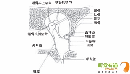 <span style="font-size:16px;"> 中耳結(jié)構(gòu)包括鼓室、咽鼓管、鼓竇和乳突腔四部分。鼓室內(nèi)有聽骨、肌肉、韌帶和神經(jīng)。中耳是換能器,換能是將一種能量形式轉(zhuǎn)換成另一種能量形式,中耳通過鼓膜和聽骨鏈將聲能轉(zhuǎn)換為機(jī)械能,再由鐙骨底板將機(jī)械能轉(zhuǎn)換為內(nèi)耳的液態(tài)能。</span></p><p><span style="font-size:16px;"> 鼓膜是中耳和外耳的分界,呈橢圓形,中間稍向內(nèi)凹陷,色灰白,較透明,與耳道底約呈30°角。鼓膜寬約8mm,高約9mm,厚0.1mm,質(zhì)地韌,其構(gòu)造分三層:外層是皮膚層,中層由淺層的放射狀和深層的環(huán)狀纖維組成,它們使得鼓膜能承受一定的氣壓和水壓并抗感染,內(nèi)層為粘膜層,與鼓室粘膜相連續(xù)。聲音的振動,即聲能,通過耳郭和耳道共振的加強(qiáng),引起鼓膜隨之振動,鼓膜與中耳的錘骨相連,在正常耳,錘骨懸掛在自鼓膜頂端至下2/3處。錘骨柄的尖端將鼓膜頂向中耳,形成錐形鼓膜的頂,稱作臍。自臍向前下達(dá)鼓膜邊緣有一個(gè)三角形的反光區(qū),名光錐,是外來光線被鼓膜的凹面集中反射而成。鼓膜下4/5為緊張部,上1/5由于缺乏纖維層而較松馳,稱為松弛部。鼓膜可分為前上、前下、后上、后下四個(gè)象限。兒童的鼓膜薄而有彈性,年齡越大,鼓膜越厚且越僵硬。鼓環(huán)將鼓膜固定在某一位置,使其成為在外耳和中耳之間的一層防水防氣的屏障。</span></p><center><span style="font-size:16px;"><img alt="" src="/upfiles/201810080137189845.png" width="440" height="250" /></span></center><p></p><p><span style="font-size:16px;"> 中耳鼓室</span></p><center><span style="font-size:16px;"><img alt="" src="/upfiles/201810080137242362.png" width="440" height="250" /></span></center><p></p><p><span style="font-size:16px;"> 正常鼓膜像(左)</span></p><p><span style="font-size:16px;"> 在中耳腔內(nèi)的聽骨是人體最小的骨頭,分別叫作錘骨、砧骨和鐙骨。這些聽骨由韌帶連接并懸掛起來形成了聽骨鏈。錘骨柄附在鼓膜上,錘骨頭與砧骨頭形成錘砧關(guān)節(jié),砧骨底與鐙骨頭形成砧鐙關(guān)節(jié),鐙骨底板由環(huán)狀韌帶固定在卵圓窗上。聽骨鏈利用杠桿原理使來自鼓膜的機(jī)械能放大,傳遞到卵圓窗。</span></p><center><span style="font-size:16px;"><img alt="" src="/upfiles/201810080137303051.png" width="440" height="250" /></span></center><p></p><p><span style="font-size:16px;"> 聽骨鏈</span></p><p><span style="font-size:16px;"> 咽鼓管是中耳通氣引流的唯一途徑,也是中耳感染的主要途徑。它的一端開口在較高的中耳鼓室腔,另一端開口在較低的鼻咽部,通過咽鼓管在鼻咽部的開口,空氣可從外界直接進(jìn)入中耳腔。咽鼓管平時(shí)處于關(guān)閉狀態(tài),能較好的防止細(xì)菌感染,只有在咳嗽、擤鼻涕、打哈欠或吞咽時(shí),咽鼓管才開放。當(dāng)咽鼓管開放時(shí),根據(jù)鼓膜外側(cè)的壓力情況,空氣或者從中耳流向外界,或者從外界流向中耳,使中耳壓力得以平衡。</span></p><p><span style="font-size:16px;"> 更多詳情請登錄www.caosairsoft.com</span></p>" />