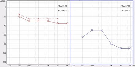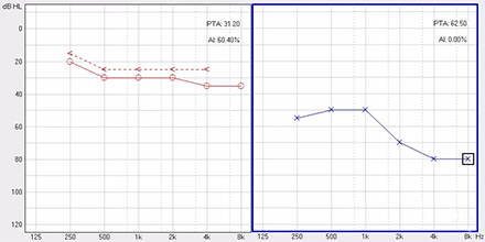 <span style="font-size:16px;"> 純音聽(tīng)閾測(cè)試是聽(tīng)力學(xué)所有測(cè)試項(xiàng)目中最基本的一項(xiàng)內(nèi)容,包括氣導(dǎo)(AC)、骨導(dǎo)(BC)、最舒適閾(MCL)與不舒適閾(UCL)測(cè)試。測(cè)試結(jié)果能夠直接反映患者雙耳的聽(tīng)力損失程度、性質(zhì)與動(dòng)態(tài)范圍,還能夠間接反映患者的患病位置、病因與助聽(tīng)后效果。</span></p><p><span style="font-size:16px;"> 一般地,整個(gè)檢查控制在10分鐘左右,既能全面做完檢查,又不至患者疲憊而影響主觀反應(yīng)。</span></p><p><span style="font-size:16px;"> 純音聽(tīng)閾測(cè)試是最考驗(yàn)聽(tīng)力學(xué)工作者實(shí)際工作能力的一項(xiàng)基本內(nèi)容:</span></p><p><span style="font-size:16px;"> 1、若患者曾長(zhǎng)期暴露于噪聲中,且無(wú)其它致聾因素,很可能在3 kHz或6 kHz出現(xiàn)明顯的下降,聽(tīng)力曲線呈現(xiàn)“V”字形,所以除了常規(guī)的倍頻程頻率外,還要加測(cè)這兩個(gè)頻率,否則就犧牲了多通道助聽(tīng)器的意義;</span></p><p><span style="font-size:16px;"> 除了有過(guò)噪聲接觸史的患者需要加測(cè)半倍頻程外,涉及聲場(chǎng)助聽(tīng)聽(tīng)閾評(píng)估、賠償?shù)惹闆r都需要加測(cè)半倍頻程。</span></p><p><span style="font-size:16px;"> 耳鳴困擾的患者,注意避免與耳鳴聲類似的純音,若還用純音作為刺激聲,患者就會(huì)分辨不清,出現(xiàn)假陽(yáng)性或假陰性。所以,測(cè)試者要換成囀音,既有別于耳鳴聲,又具有頻率特異性。</span></p><p><span style="font-size:16px;"> 2、不舒適閾反映患者對(duì)大聲的忍耐力,不舒適閾與氣導(dǎo)的差值能顯示患者的動(dòng)態(tài)范圍,指導(dǎo)驗(yàn)配師調(diào)節(jié)助聽(tīng)器的最大輸出。</span></p><p><span style="font-size:16px;"> 不舒適閾測(cè)試頻率是否越多越好呢?非也。測(cè)得頻率過(guò)多,一會(huì)引起患者疲勞或不適,二是沒(méi)必要,大多數(shù)助聽(tīng)器的最大輸出是一個(gè)整體,不能像調(diào)增益和壓縮那樣分通道,所以測(cè)多了并無(wú)好處,一般測(cè)0.5、1、2、4 kHz。</span></p><p><span style="font-size:16px;"> 3、如果兩側(cè)聽(tīng)力有明顯差異,此時(shí)就要準(zhǔn)備好掩蔽了,分為氣導(dǎo)掩蔽與骨導(dǎo)掩蔽。</span></p><p><span style="font-size:16px;"> (1)氣導(dǎo)掩蔽的判斷有兩個(gè)原則,只要符合其中一個(gè)原則,就需要重新測(cè)差耳氣導(dǎo)。具體做法是:</span></p><p><span style="font-size:16px;"> 測(cè)試完雙耳氣導(dǎo),若發(fā)現(xiàn)某一頻率差耳氣導(dǎo)閾值比好耳氣導(dǎo)閾值多40 dB以上就要懷疑有可能是好耳偷聽(tīng)的,需要給好耳氣導(dǎo)加掩蔽聲;</span></p><p><span style="font-size:16px;"> 測(cè)試完雙耳氣導(dǎo)與好耳骨導(dǎo),若發(fā)現(xiàn)某一頻率差耳氣導(dǎo)閾值比好耳骨導(dǎo)閾值多40 dB以上就要懷疑有可能是好耳偷聽(tīng)的,需要給好耳氣導(dǎo)加掩蔽聲。</span></p><p><span style="font-size:16px;"> 下面為未掩蔽的聽(tīng)力圖:</span></p><center><span style="font-size:16px;"><img alt="" src="/upfiles/201810160133207570.png" width="440" height="220" /></span></center><p></p><p><span style="font-size:16px;"> 下圖為掩蔽后的左耳真實(shí)氣導(dǎo)值:</span></p><center><span style="font-size:16px;"><img alt="" src="/upfiles/201810160133289538.png" width="440" height="220" /></span></center><p></p><p><span style="font-size:16px;"> (2)骨導(dǎo)掩蔽的判斷原則:</span></p><p><span style="font-size:16px;"> 測(cè)試完雙耳氣導(dǎo)與好耳骨導(dǎo),若發(fā)現(xiàn)某一頻率差耳氣導(dǎo)閾值比好耳骨導(dǎo)閾值大于等于15 dB就必須予以掩蔽,重測(cè)骨導(dǎo)。下圖為右耳氣導(dǎo)加掩蔽后左耳骨導(dǎo)的真實(shí)值:</span></p><center><span style="font-size:16px;"><img alt="" src="/upfiles/201810160133368026.png" width="440" height="220" /></span></center><p></p><p><span style="font-size:16px;"> 注意:</span></p><p><span style="font-size:16px;"> 1)掩蔽的規(guī)則要按順序適用;</span></p><p><span style="font-size:16px;"> 2)各頻率根據(jù)規(guī)則決定是否需要加掩蔽;</span></p><p><span style="font-size:16px;"> 3)很少需要掩蔽所有頻率,通常氣導(dǎo)掩蔽頻率不應(yīng)超三個(gè),骨導(dǎo)掩蔽頻率不應(yīng)超兩個(gè),否則受試者會(huì)疲憊不堪。</span></p><p><span style="font-size:16px;"> 醫(yī)院測(cè)聽(tīng)的主要目的是診斷和鑒別聽(tīng)力損失的性質(zhì)和程度,驗(yàn)配中心的主要目的是盡可能地幫助患者選擇并調(diào)試好助聽(tīng)器。</span></p><p><span style="font-size:16px;"> 更多詳情請(qǐng)登錄www.caosairsoft.com</span></p>" />