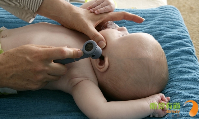 新生兒聽力篩查是通過耳聲發射、自動聽性腦干反應和聲阻抗等電生理學技術,在新生兒出生后自然睡眠或安靜的狀態下進行客觀、快速和無創的檢查。一般僅用5~10分鐘就可以完成測試。新生兒在出生48小時以后,要接受初次聽力篩查,未通過初篩者,在42天左右接受聽力復查,42天復查仍未通過者,在3個月左右進行聽力診斷性檢查。確診為聽損傷的患兒應及時到醫院的專科進行相應的醫學干預。