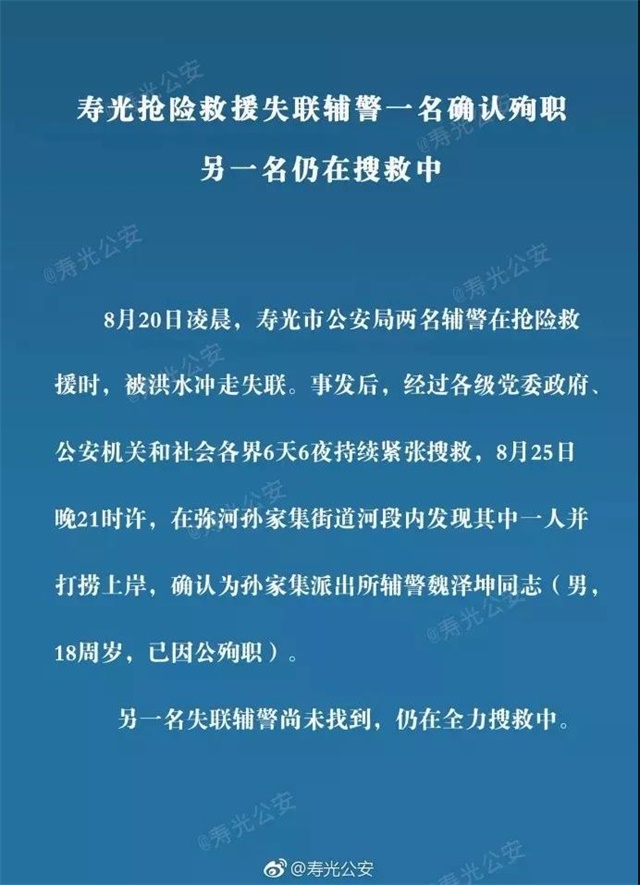 <span style="font-size: 16px;"> 2018年8月20日凌晨,壽光市兩名輔警在搶險(xiǎn)救援時,被洪水沖走失聯(lián)。事發(fā)后,經(jīng)過連續(xù)幾天的緊張搜救,他們以我們最不愿意看到的方式歸來了。</span></p><p><span style="font-size: 16px;"> 8月25日晚21時許,在彌河孫家集街道河段內(nèi)發(fā)現(xiàn)一人,確認(rèn)為孫家集派出所輔警魏澤坤同志(男,18周歲,因公殉職)。</span></p><p><span style="font-size: 16px;"> 8月28日下午16時,在彌河孫家集街道河段西岸發(fā)現(xiàn)另一名輔警,確認(rèn)為孫家集派出所孫超同志(男,33歲,因公殉職)。</span></p><p><span style="font-size: 16px;"> 他是家里的頂梁柱啊</span></p><p><span style="font-size: 16px;"> 33歲的孫超是家里的頂梁柱,他的愛人郭立華是聽覺有道的店長。</span></p><p><span style="font-size: 16px;"> 孫超有一子一女,大女兒才滿10歲,父母年近60,身體都不是很好。還有一個85歲的老奶奶,身體也不好,孫超失蹤時,一家人一直都不敢告訴她消息。</span></p><p><span style="font-size: 16px;"> 18日早,因?yàn)橄掠辏瑢O超怕路不好走,還提前送郭店長到門店上班,然后才回派出所。</span></p><p><span style="font-size: 16px;"> 事發(fā)前2小時,他們夫妻互通了電話。孫超說,自己全身濕透了,水很大,11點(diǎn)之后,就沒有了音訊。</span></p><p><span style="font-size: 16px;"> 他們夫妻倆都是好員工,孫超還是共產(chǎn)黨員,他們沒有好好地拍過幾張全家福,甚至沒能抽空一家人好好玩一天。</span></p><p><span style="font-size: 16px;"> 孫超是個好老公,他一回家就看孩子,哄孩子睡覺,一有空就給老婆孩子洗衣服。為了省錢養(yǎng)家,他連幾十塊錢的鞋子都舍不得買,老婆給他買回來了,他還不舍得穿……</span></p><p><span style="font-size: 16px;"> 對于我們而言,郭店長和孫超都像家人一樣,我們多么期盼他是平平安安地回來。</span></p><p><span style="font-size: 16px;"> 化作春泥更護(hù)花</span></p><p><span style="font-size: 16px;"> 兩位輔警失蹤的幾天,我們看到了人們對英雄的珍惜。</span></p><p><span style="font-size: 16px;"> 濰坊市調(diào)集了1000多名警力、700多名沿河鎮(zhèn)街干部群眾、11支專業(yè)救援隊(duì)、18艘沖鋒舟、20架無人機(jī)、10頭搜救犬等,全線展開大范圍搜尋。</span></p><p><span style="font-size: 16px;"> 還有很多人民群眾,也自發(fā)參與了本次救援,總計(jì)6000多人,為了找到2個人,找了幾天幾夜,很多人都沒怎么好好睡覺。</span></p><p><span style="font-size: 16px;"> 他們最希望的,是把他們安全帶回來。反正無論如何,都要把他們找到。</span></p><p><center><img src="/upfiles/201808310437256664.jpg" alt="" /></center><center><br /></center><center> <img src="/upfiles/20180831043725120.jpg" alt="" /> </center><center><br /></center><center><img src="/upfiles/20180831043725884.jpg" alt="" /> </center><center><br /></center><center><img src="/upfiles/201808310437253890.jpg" alt="" /></center><center><br /></center><center> <img src="/upfiles/201808310437262486.jpg" alt="" /> </center><center><br /></center><center><img src="/upfiles/20180831043726269.jpg" alt="" /></center><center><br /></center><center> <img src="/upfiles/201808310437264172.jpg" alt="" /> </center><center><br /></center><center><img src="/upfiles/201808310437261506.jpg" alt="" /></center><center><br /></center><center> <img src="/upfiles/201808310437267495.jpg" alt="" /></center><center><br /></center><center> <img src="/upfiles/201808310437262138.jpg" alt="" /><span style="font-size: 16px;"> </span><span style="font-size: 16px;"> </span></center></p><p></p><p><span style="font-size: 16px;"> 而很多人,在各個地方關(guān)注著這一切。</span></p><p><span style="font-size: 16px;"> 他們可能身處中國的各個角落,平時有各自的愛好,從事著不同的職業(yè),跟我們一樣,他們也都為兩位輔警擔(dān)憂過,祈禱過。</span></p><p><center><span style="font-size: 16px;"> <img src="/upfiles/201808310438352320.jpg" alt="" /> </span></center><center><span style="font-size: 16px;"><br /></span></center><center><span style="font-size: 16px;"><img src="/upfiles/201808310438359206.jpg" alt="" /></span></center><center><span style="font-size: 16px;"><br /></span></center><center><span style="font-size: 16px;"> <img src="/upfiles/201808310438359231.jpg" alt="" /></span></center></p><p></p><p><span style="font-size: 16px;"> 令人惋惜和哀痛的是,我們沒能等到想要的結(jié)局。但我們深知,兩位輔警并沒有徹底消失,在這片他們生活過的土地上,每一個角落都存在著他們的身影。</span></p><p><span style="font-size: 16px;"> 愿英雄安息</span></p><p><span style="font-size: 16px;"> 唯物者不信鬼神的存在,但兩位輔警的精神定與日月同輝;風(fēng)雨飄搖盡顯英雄本色,被風(fēng)雨洗禮的人們會記住孫超、魏澤坤這兩個名字,因?yàn)樗麄兩淖詈笠豢蹋冀K代表著人民的名義。</span></p><p><span style="font-size: 16px;"> 兩位英雄,他們?yōu)榱藫岆U(xiǎn)救援,離開了人世。</span></p><p><span style="font-size: 16px;"> 他們把最美好的青春歲月獻(xiàn)給了警營,留給了老百姓,卻還沒來得及跟自己的家人說一聲再見,多么令人哀痛和讓人崇敬!</span></p><p style="text-align: center;"><span style="font-size: 16px;"><img src="/upfiles/201808310439091398.jpg" alt="" /></span></p><p style="text-align: center;"><span style="font-size: 16px;"><br /></span></p><p style="text-align: center;"><span style="font-size: 16px;"> <img src="/upfiles/201808310439095302.jpg" alt="" /></span></p><p style="text-align: center;"><span style="font-size: 16px;"><br /></span></p><p style="text-align: center;"><span style="f