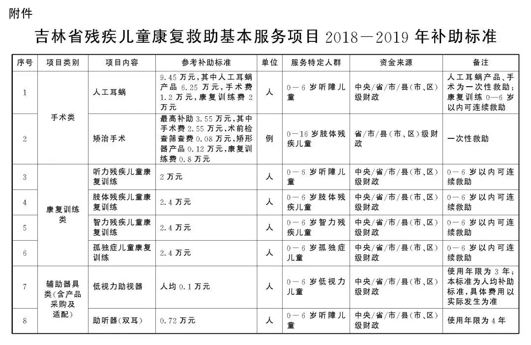 各市(州)人民政府,長白山管委會,長春新區管委會,各縣(市)人民政府,省政府各廳委辦、各直屬機構:</p><p>  為深入貫徹黨的十九大“發展殘疾人事業,加強殘疾康復服務”的總體部署,全面落實《殘疾預防和殘疾人康復條例》和《國務院關于建立殘疾兒童康復救助制度的意見》(國發〔2018〕20號)精神,不斷改善殘疾兒童康復狀況,促進殘疾兒童全面發展,切實減輕殘疾兒童家庭負擔,完善殘疾兒童康復救助社會保障體系,提出如下意見。</p><p>  一、總體要求</p><p>  (一)指導思想。</p><p>  以習近平新時代中國特色社會主義思想為指導,全面深入貫徹黨的十九大和十九屆二中、三中全會精神,認真落實黨中央、國務院決策部署,統籌推進“五位一體”總體布局和協調推進“四個全面”戰略布局,堅持以人民為中心的發展思想,牢固樹立新發展理念,按照兜底線、織密網、建機制的要求,著力保障殘疾兒童基本康復服務需求,努力實現殘疾兒童“人人享有康復服務”,使殘疾兒童家庭獲得感、幸福感、安全感更加充實、更有保障、更可持續。</p><p>  (二)基本原則。</p><p>  堅持制度銜接、應救盡救。加強與基本醫療、臨時救助等社會保障制度的有效銜接,確保殘疾兒童家庭求助有門、救助及時。</p><p>  堅持盡力而為、量力而行。堅守底線、突出重點、完善制度、引導預期,著力滿足殘疾兒童基本康復服務需求。</p><p>  堅持規范有序、公開公正。建立科學規范、便民高效的運行機制,主動接受群眾和社會監督,做到公開透明、結果公正。</p><p>  堅持政府主導、社會參與。更好發揮政府“保基本”作用,不斷推進基本康復服務均等化;更好發揮社會力量作用,不斷擴大康復服務供給,提高康復服務質量。</p><p>  (三)總體目標。</p><p>  到2020年,建立與全面建成小康社會目標相適應的殘疾兒童康復救助制度體系,形成黨委領導、政府主導、殘聯牽頭、部門配合、社會參與的殘疾兒童康復救助工作格局,基本實現殘疾兒童應救盡救。</p><p>  到2025年,殘疾兒童康復救助制度體系更加健全完善,殘疾兒童康復服務供給能力顯著增強,服務質量和保障水平明顯提高,殘疾兒童普遍享有基本康復服務,健康成長、全面發展權益得到有效保障。</p><p>  二、制度內容</p><p>  (一)救助對象條件。</p><p>  救助對象應同時具備以下條件:</p><p>  1.具有吉林省戶籍(或持有吉林省內居住證),有康復需求的0-6歲視力、聽力、言語、肢體、智力等殘疾兒童和孤獨癥兒童。</p><p>  2.已辦理《中華人民共和國殘疾人證》,或持具有診斷資質的縣級以上醫療機構出具的醫學診斷的殘疾兒童。</p><p>  (二)救助內容和標準。</p><p>  救助內容包括以減輕功能障礙、改善功能狀況、增強生活自理和社會參與能力為主要目的的手術、輔助器具配置和康復訓練等。救助服務項目及補助標準依據年度《吉林省殘疾兒童康復救助基本服務項目補助標準》執行。</p><p>  各市(州)、縣(市、區)政府要依據本地財力狀況、保障對象數量、殘疾類別等,分類確定本地康復救助基本服務項目的經費補助標準,可在省確定的項目和標準基礎上,根據本地實際增加殘疾兒童康復救助基本服務項目,擴大殘疾兒童康復救助的年齡范圍,并建立項目和標準的動態調整機制。</p><p>  (三)工作流程。</p><p>  申請。殘疾兒童監護人向殘疾兒童戶籍所在地(居住證發放地)縣級殘聯提出申請。監護人也可委托他人、社會組織、社會救助經辦機構等代為申請。兒童福利機構收留撫養的殘疾兒童由其所在兒童福利機構代為申請。</p><p>  審核。縣級殘聯負責對殘疾兒童救助申請進行審核。</p><p>  救助。殘疾兒童康復救助由定點康復機構負責組織實施。定點康復機構由省殘聯會同省衛生健康、教育、民政等部門進行評審,符合條件的確定為定點康復機構,并向社會公開,經審核符合條件的殘疾兒童,可在戶籍所在地或居住地自主選擇定點康復機構。定點康復機構須對殘疾兒童進行康復評估,并根據評估結果制定康復計劃。必要時,由上一級殘聯組織和衛生健康等部門指定的醫療、康復機構做進一步診斷和康復需求評估。</p><p>  結算。殘疾兒童在定點康復機構接受康復救助服務發生的費用,經縣級殘聯審核后,由同級財政部門與定點康復機構直接結算,結算周期由縣級殘聯商同級財政部門確定。</p><p>  殘疾兒童殘疾診斷、康復救助項目屬于基本醫療保險保障范圍的,由醫保部門按相關規定給予報銷;屬于醫療救助等臨時救助范圍的,由業務主管部門按規定給予救助。</p><p>  (四)經費保障。</p><p>  各市(州)、縣(市、區)政府應將殘疾兒童康復救助資金納入政府預算,同時健全多渠道籌資機制,鼓勵引導社會捐贈。省財政依據各地經濟狀況、績效目標完成情況對各地給予適當補助。</p><p>  三、組織實施</p><p>  (一)加強組織領導。</p><p>  殘疾兒童康復救助工作實行地方政府負責制。各市(州)、縣(市、區)政府要將殘疾兒童康復救助工作列入重要議事日程,作為政府目標管理和績效考核重要內容,對不作為、慢作為、亂作為的單位和個人加大行政問責力度,對違紀違法的嚴肅追究責任。各級殘聯和民政、人力資源社會保障、衛生健康、教育、市場監管等有關部門要履職盡責、協作配合,加強工作銜接和信息共享,深化“放管服”改革,努力實現“只跑一次”“一站式結算”,切