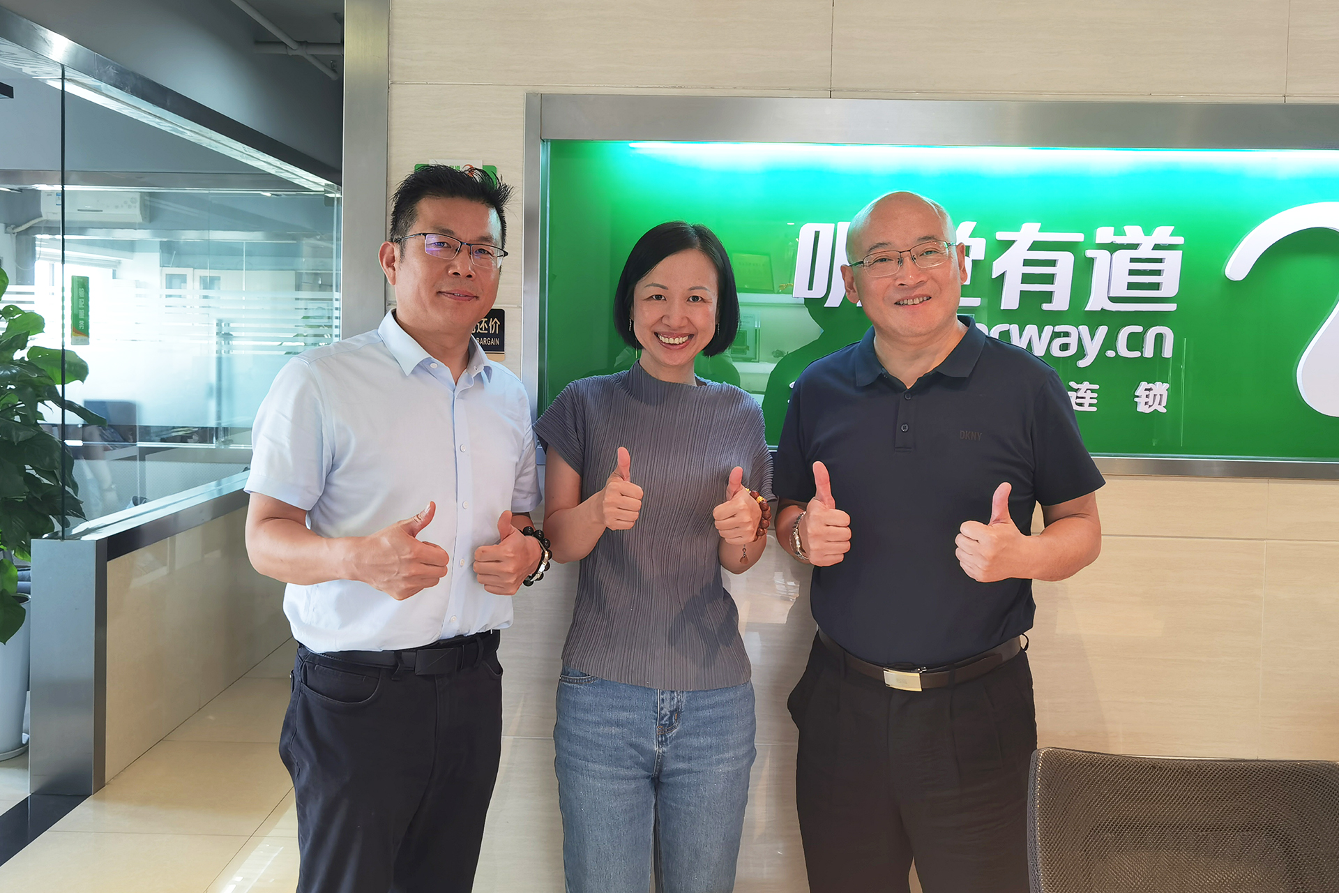 GN大北歐聽力中國區董事總經理孫曉沂率領銷售及培訓總監陳敬、客戶服務部總監張容艷、客戶服務高級主管周永樂、運營及項目部高級經理黃佳楠、售后服務經理陳海華、華西大區經理孫彥東、業務拓展部南區專員郭鳴一行八人到訪聽覺有道全國運營中心。